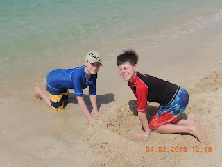 Monday morning Jason and Jacob went for a run. We got beach towels and put them out on the chairs in front of our place and sat for a bit. It was so peaceful! About 8:30 we woke Amber up so we could go and get another great breakfast. I love the Belgium waffles they make! After breakfast we went upstairs and thanked the tourist office I had booked our tours through b/c everything he had recommended was great. I had prebooked things with him before we got here. Then we had to buy Amber a sun hat. I forgot to bring one for her and her head was getting a little bit red. We then went to the heated pool at the other end of the resort. It isn't as crowded down here so we stayed until lunch and ate at the outside little restaurant between the pool and the beach. After lunch we came back to the beach by our villa and the kids played in the sand and the water.